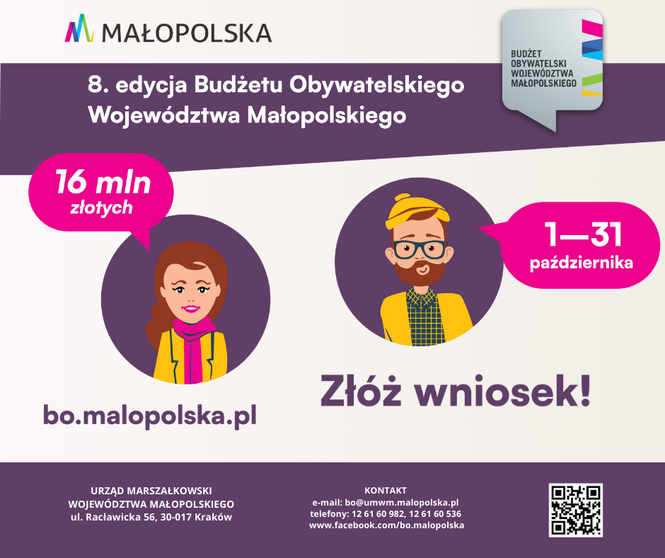 Chcesz by Twoje najbliższe otocznie, sąsiedztwo, droga do pracy czy szkoły były atrakcyjne, bezpieczne lub bardziej funkcjonalne? Widzisz potrzebę zagospodarowania przestrzeni kulturalnej, ekologicznej, sportowej bądź edukacyjnej w Twoim powiecie? A może dostrzegasz problem i masz pomysł jak coś ulepszyć? Złóż wniosek do 8. edycji Budżetu Obywatelskiego Województwa Małopolskiego!